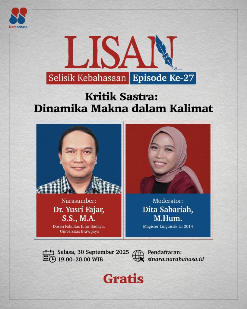 Program Selisik Kebahasaan (Lisan) episode ke-27 kembali digelar secara daring pada Selasa, 30 September 2025. Episode kali ini membahas “Kritik Sastra: Dinamika Makna dalam Kalimat” yang menghadirkan Dr. Yusri Fajar, S.S., M.A., dosen Fakultas Ilmu Budaya (FIB) Universitas Brawijaya sebagai widyaiswara, serta dipandu oleh Dita Sabariah selaku moderator.