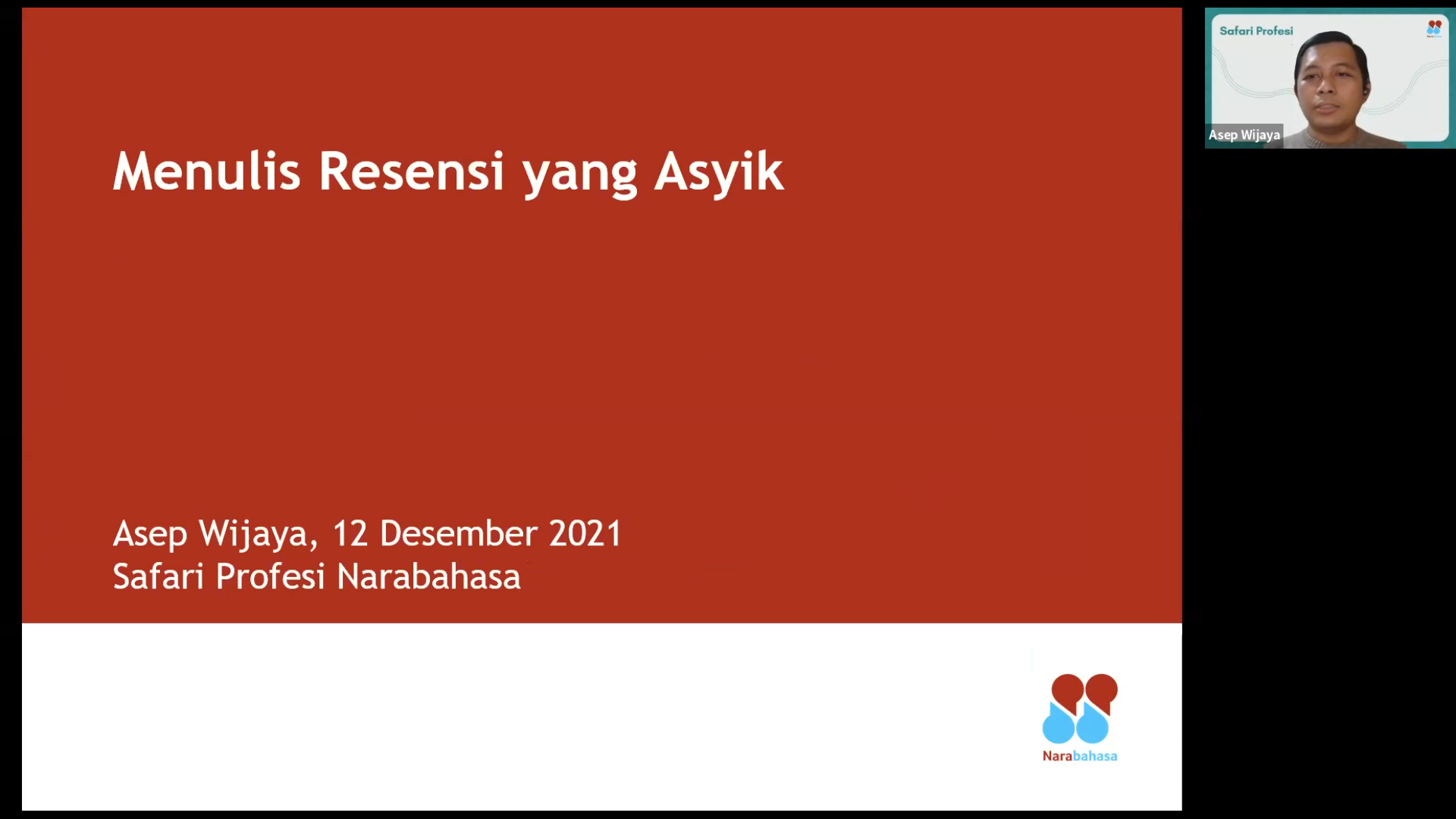 Safari Profesi bertajuk “Menulis Resensi yang Seksi” telah diselenggarakan Narabahasa pada Minggu, 12 Desember 2021, melalui ruang Zoom. Adapun yang bertugas sebagai pembicara ialah Asep Wijaya, calon widyaiswara di Narabahasa.